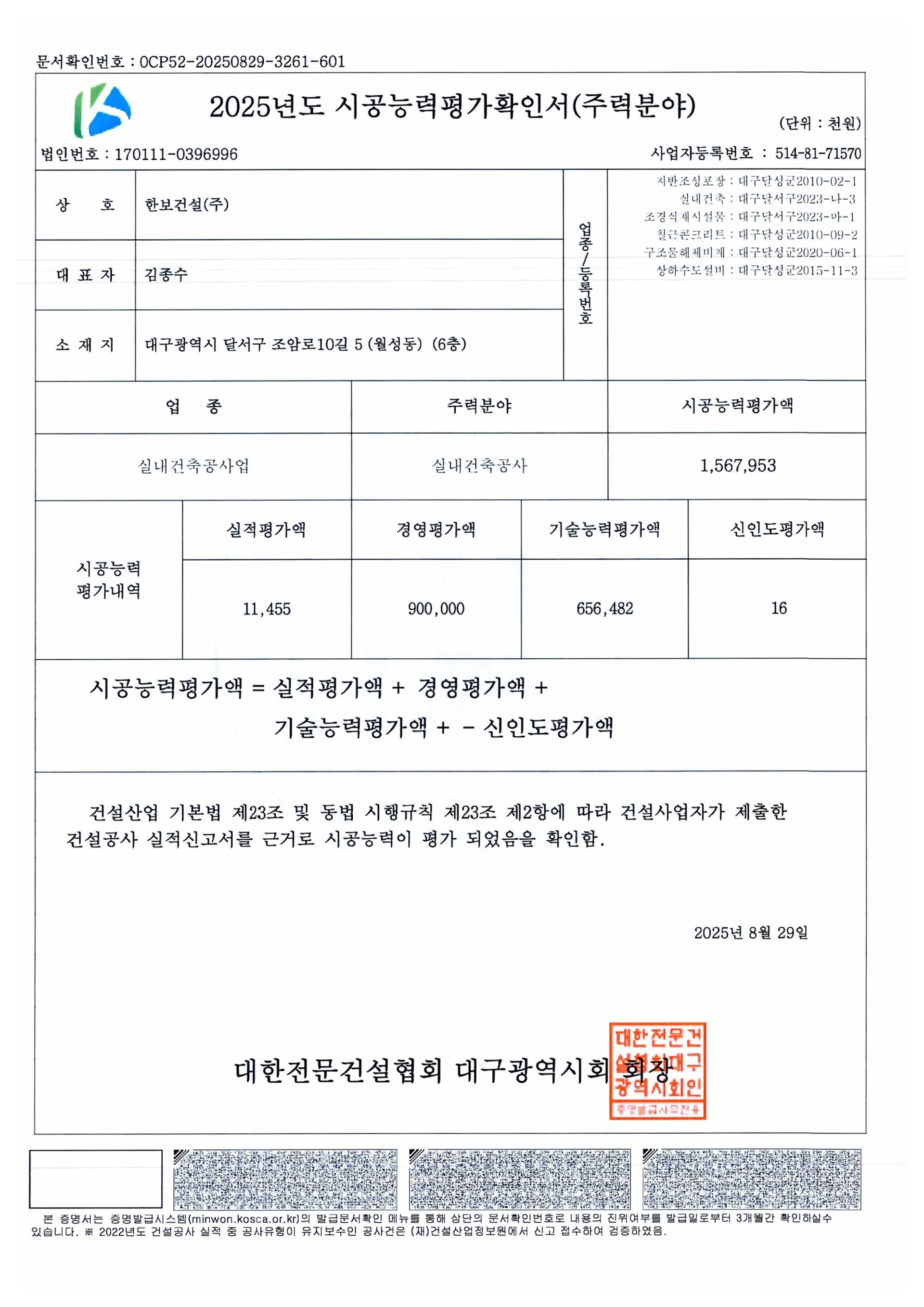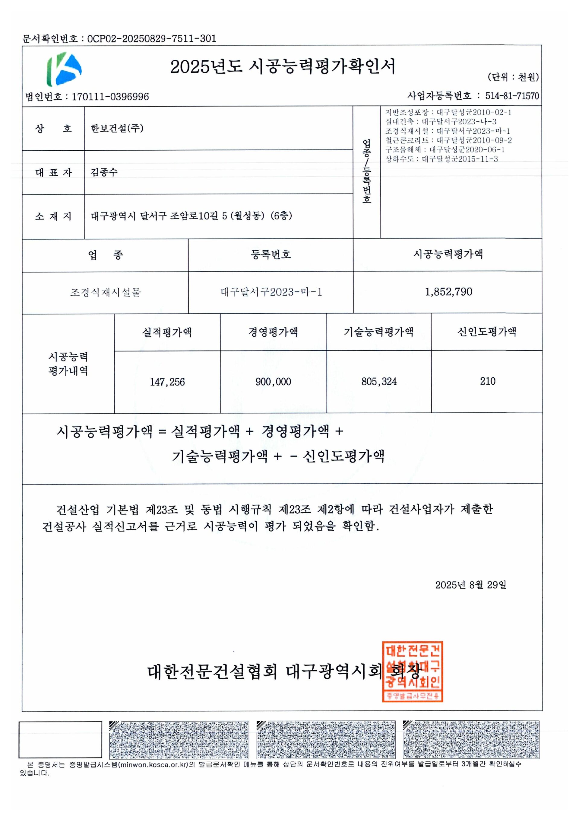 시공능력평가 확인서Construction capability evaluation confirmation 회사개요 건설업등록증 경영상태등의 확인서 시공능력평가 확인서 한보건설의 시공능력평가 확인서 현황입니다. 조경식재,시설물공사 시공능력평가확인서 조경식재,시설물공사 실내건축공사 시공능력평가확인서 실내건축공사 1 2