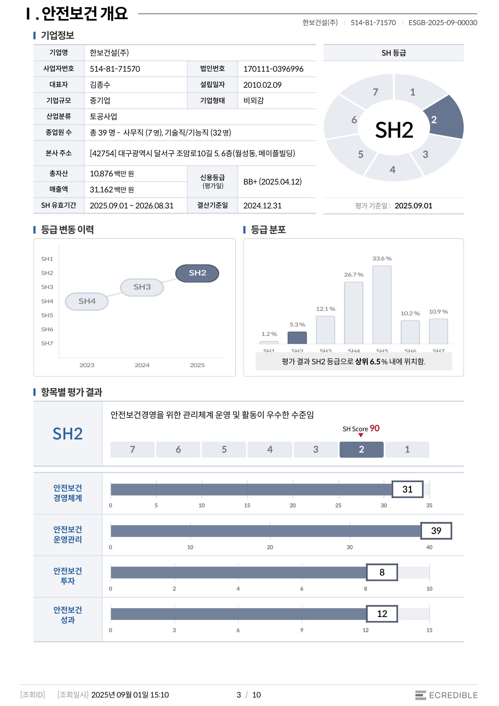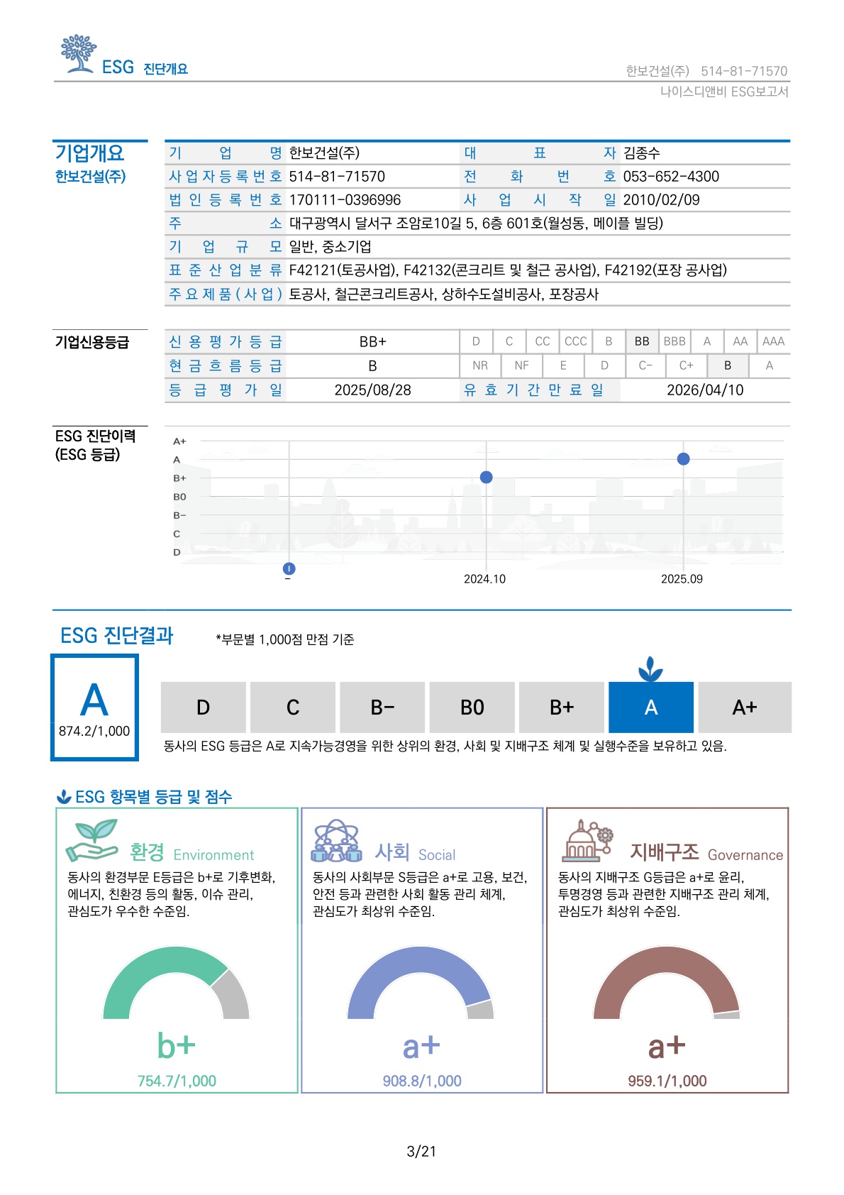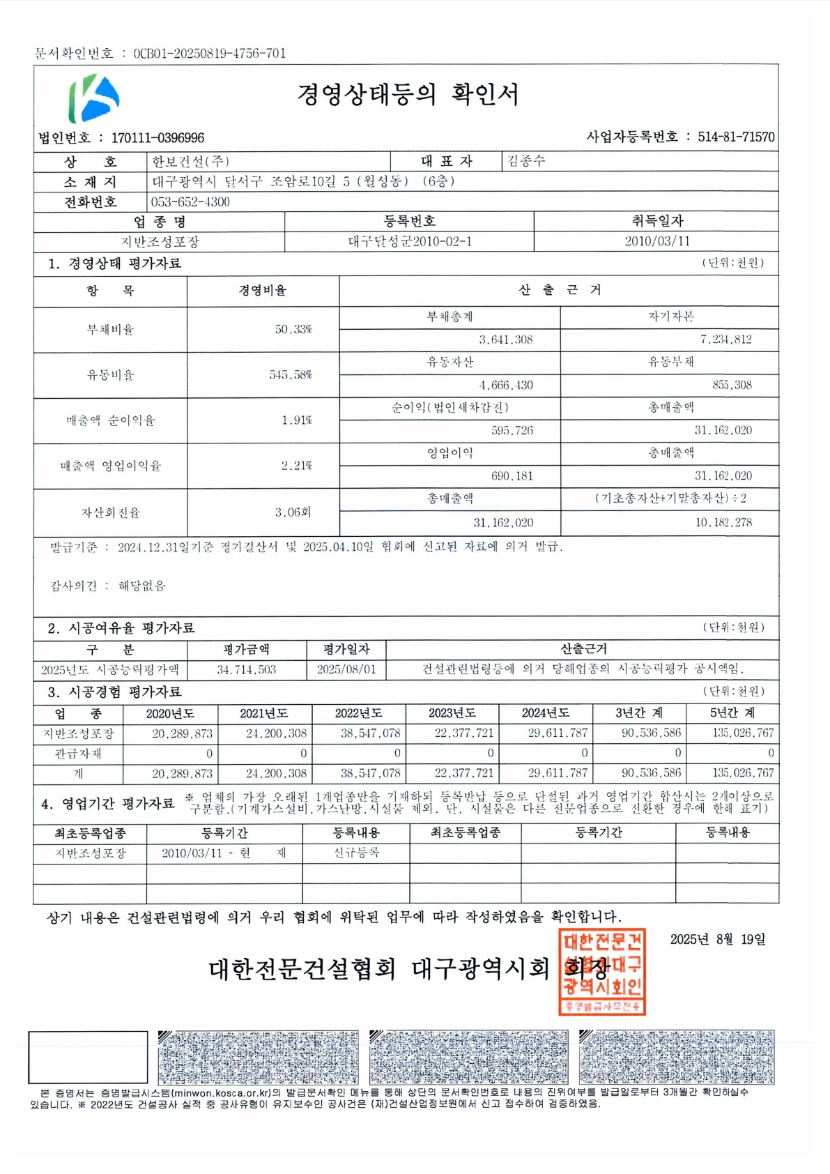 경영상태등의 확인서Confirmation of management status, etc. 회사개요 건설업등록증 경영상태등의 확인서 시공능력평가 확인서 한보건설의 경영상태 등의 현황 입니다. 지반조성포장 대구 달성군2010-02-1 경영상태등의확인서 지반조성포장 기업신용평가서 나이스디앤비 경영상태등의확인서 기업신용평가서 ESG 평가보고서 이크레더블 경영상태등의확인서 ESG 평가보고서 안전보건평가(SH) 대구 달성군2020-06-1 경영상태등의확인서 안전보건평가(SH)